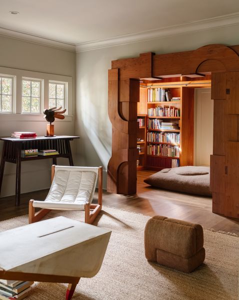 It was a request for a custom staircase runner that eventually led to the two wooden sculptures in a 1909 carpenter-style house in Berkeley: one, a threshold portal, and the other forming a reimagined fireplace mantel. The result is as singular as the request.